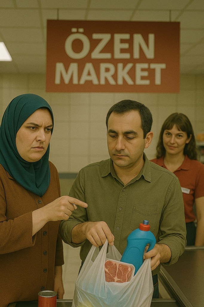 Adam kasiyerin okuttuğu ürünleri tek tek poşetliyordu. Eşi ise kasanın önünde seyrediyordu. Derken kadın adama bağırmaya başladı: